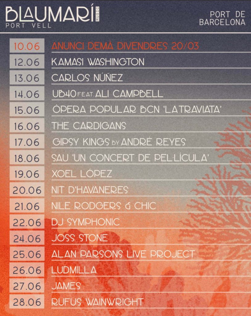 El cartell de Blaumarí Music opta por una programació molt variada que toca el jazz, el soul, el rock i la rumba. Entre els noms més destacats trobem: