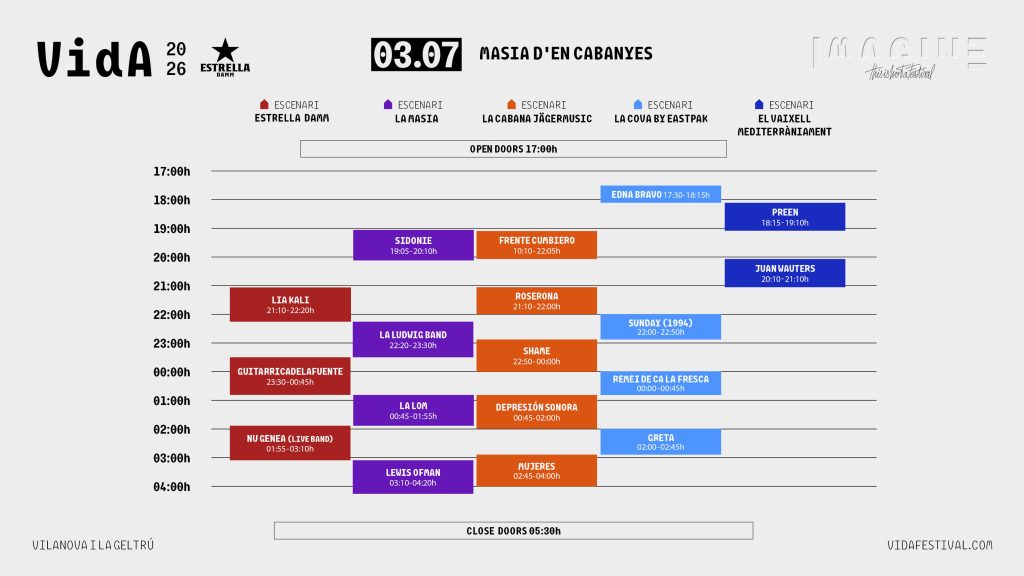 Aquests noms se sumen als pesos pesants que ja coneixíem del Cartell del VIDA 2026: la festa assegurada de Fatboy Slim, la màgia d’Amaia, la delicadesa de Guitarricadelafuente, el magnetisme de Maria Arnal o el post-folklore de Ralphie Choo. Un cartell eclèctic per a un festival que fuig de les etiquetes.